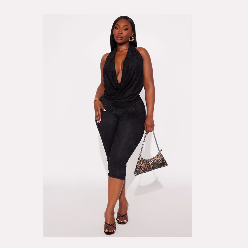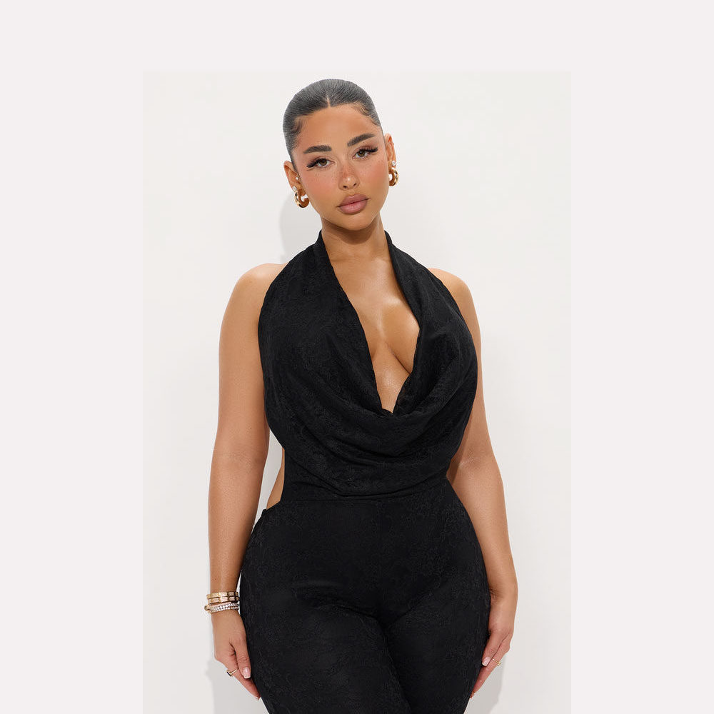 Step out in confidence with this captivating black jumpsuit. This one-piece features a dramatic cowl neck and a halter neckline that beautifully highlights the décolletage and shoulders.