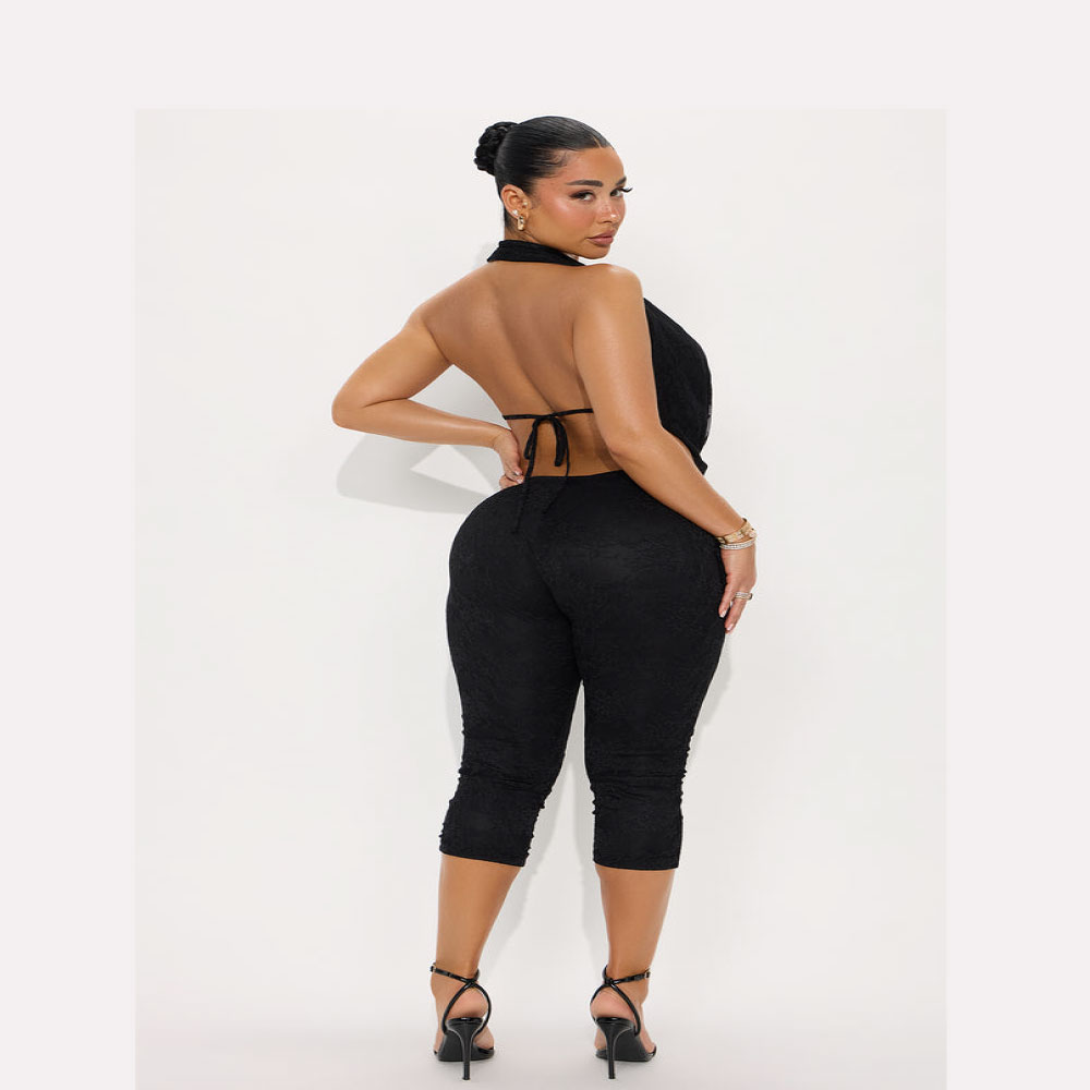 The entire garment is made from a textured, lacy, or jacquard fabric that adds depth and sophistication to the black color. It has a fitted silhouette that cinches at the waist and falls to a cropped, capri-length leg.
