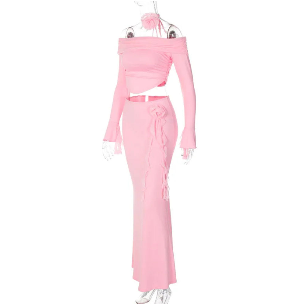 With its body hugging fit, this beautiful long sleeved top with a high waisted maxi skirt, topped with the flower embellishment is exactly what you need in your closet right now! Grab yours now