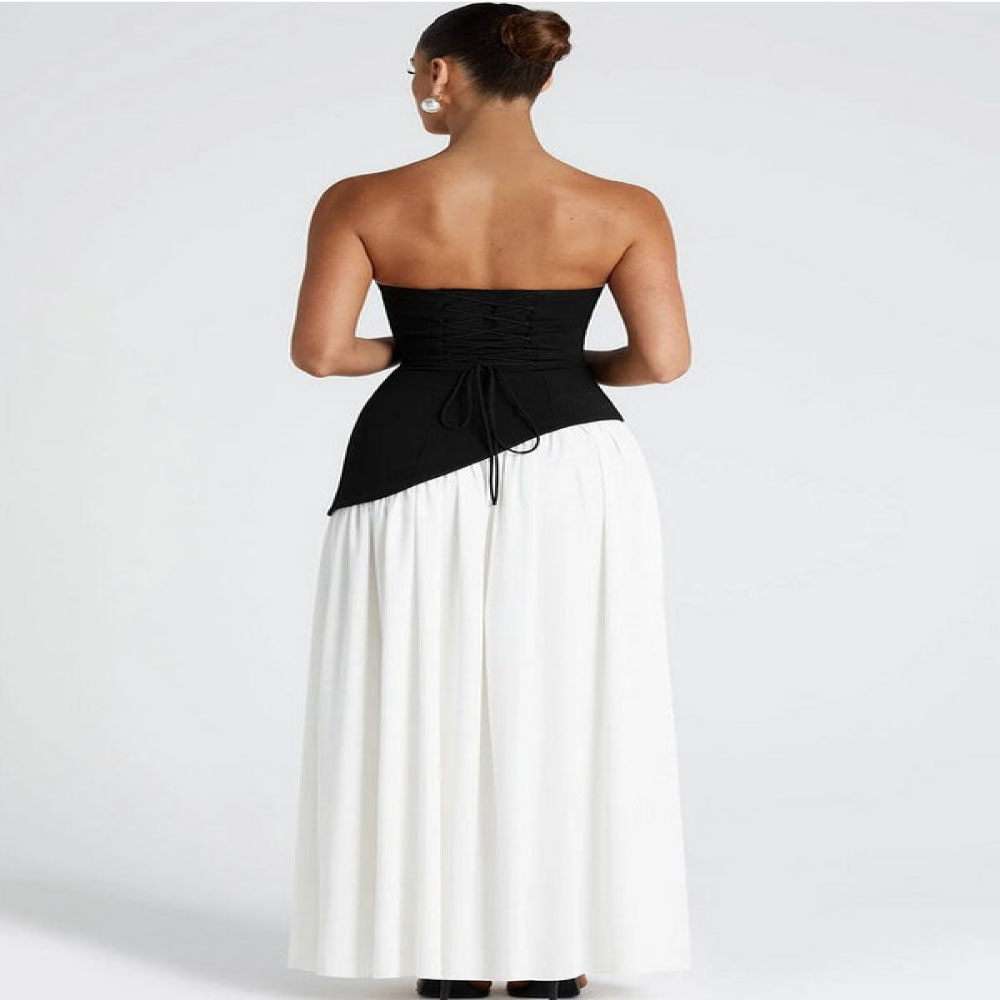 Elevate your evening look with the Maliyah maxi dress in classic black and white. This strapless maxi dress features a structured bodice with an asymmetrical hem, crafted from smooth, non-stretch crepe for an elegant, tailored fit.